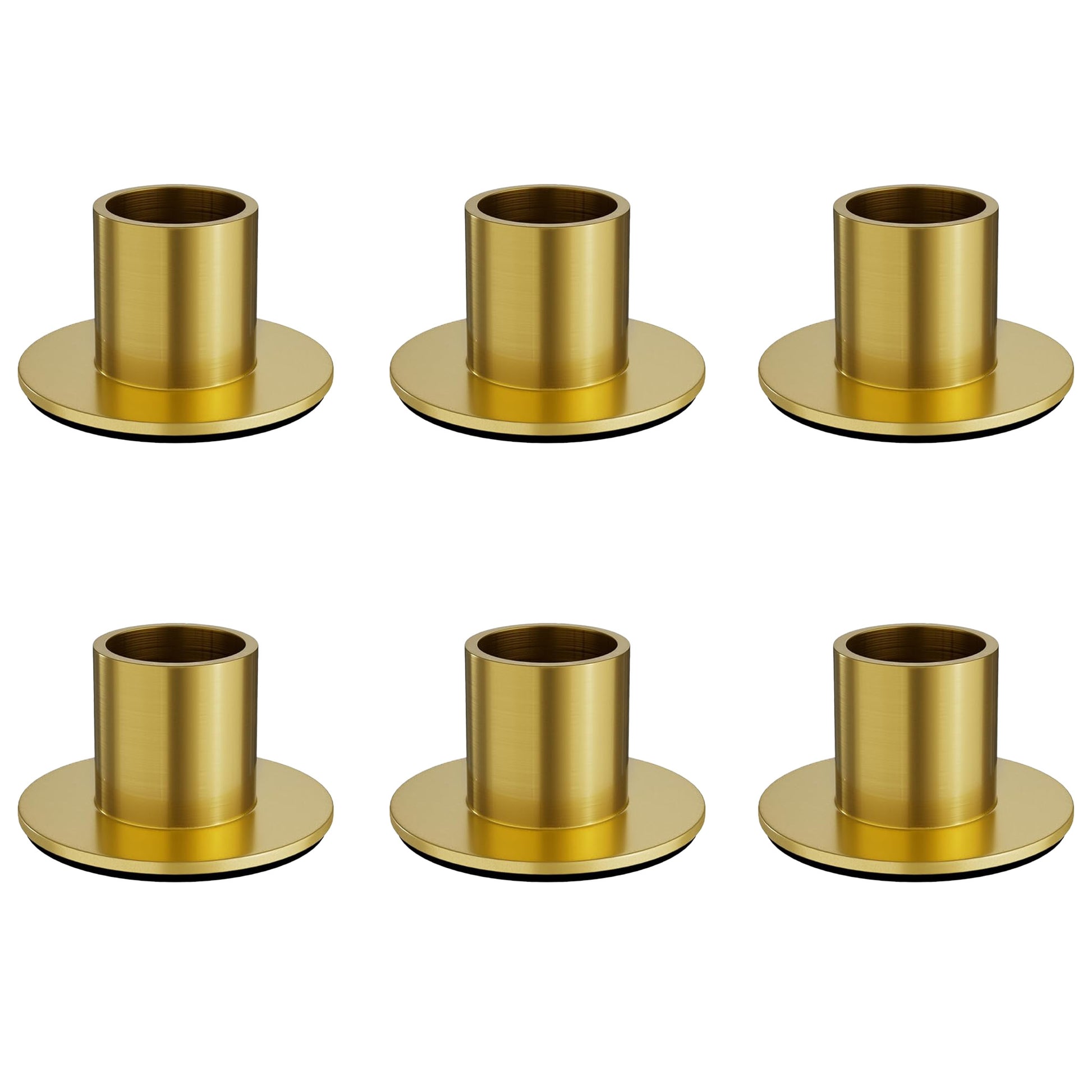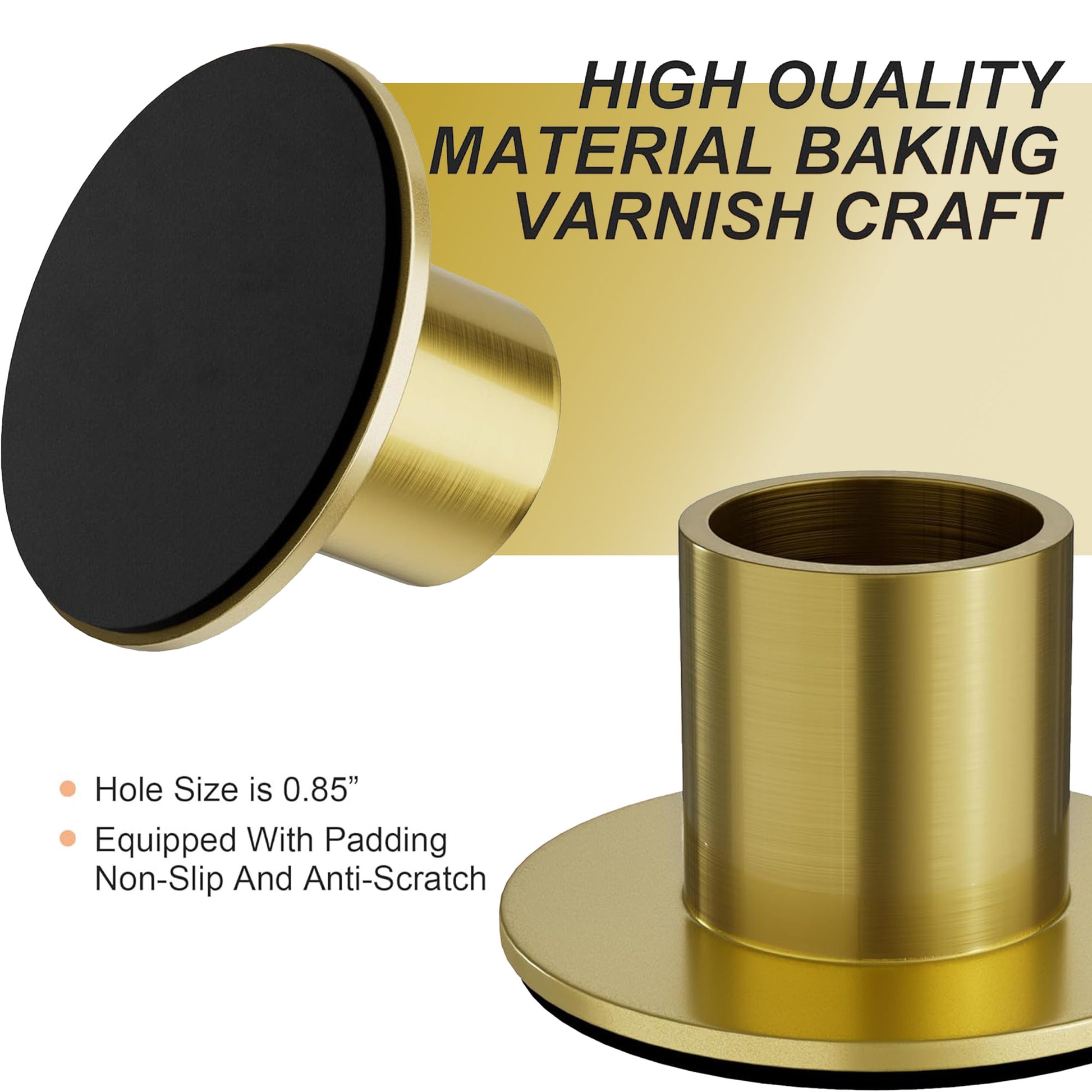 1. **Size and Packaging**: - Dimensions: L 1.96" x W 1.96" x H 1.06" . Includes 6 pieces of gold candle holders, perfect for 0.85-inch taper candles and flameless LED candles.